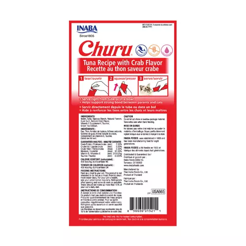 INABA Cat Snack Churu Atún y Cangrejo 4 unidades, son deliciosos snacks para gatos elaborados con Atun y cangrejo puro y natural, contiene un alto grado de humedad necesario para la salud de los felinos.