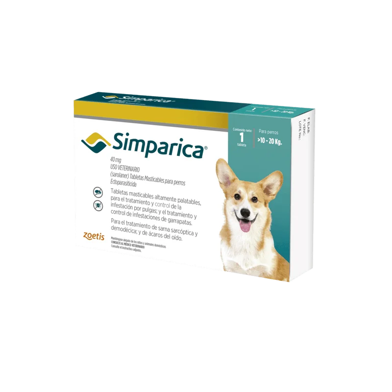 Simparica Antiparasitario Antipulgas Perros 40 mg – 10 a 20 Kg ofrece una nueva e innovadora forma de controlar las pulgas y las garrapatas en perros medianos, al proporcionar actividad inmediata y persistente durante al menos 35 días, actuando más allá del período de tratamiento mensual.